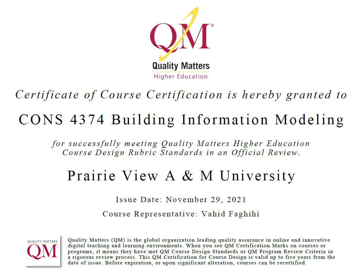 Quality Matters Certificate - CONS4374: