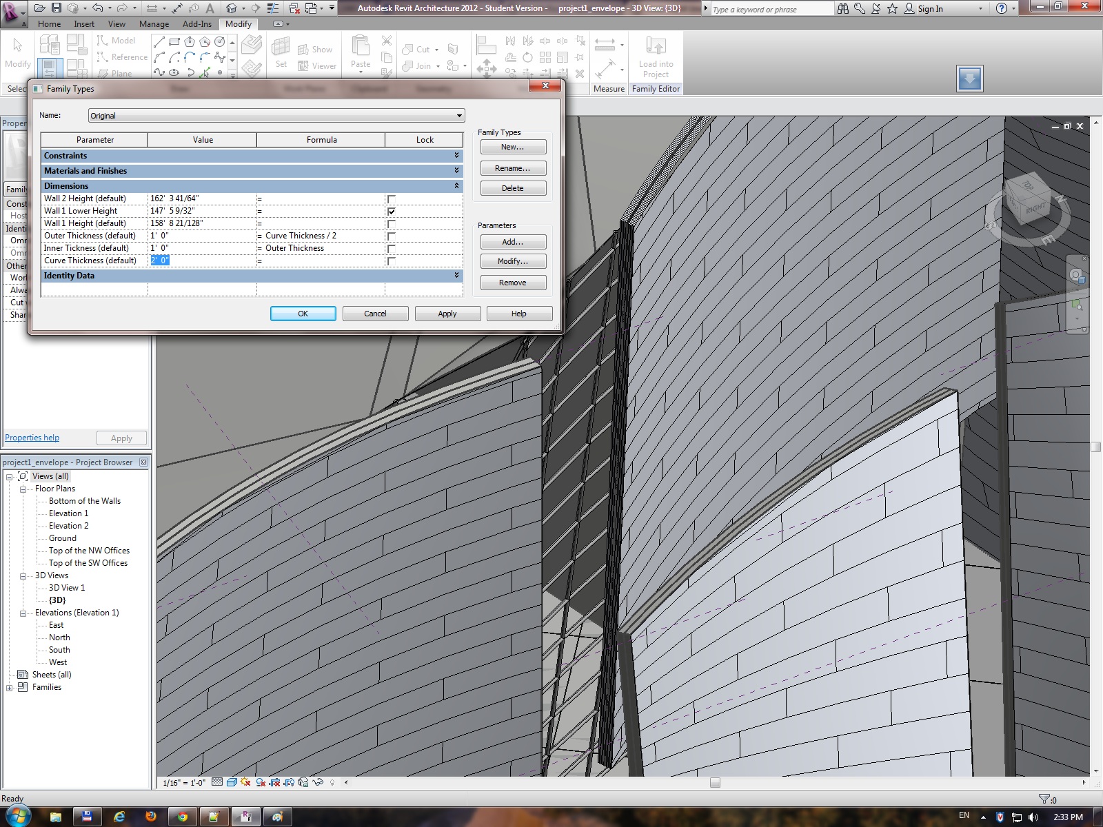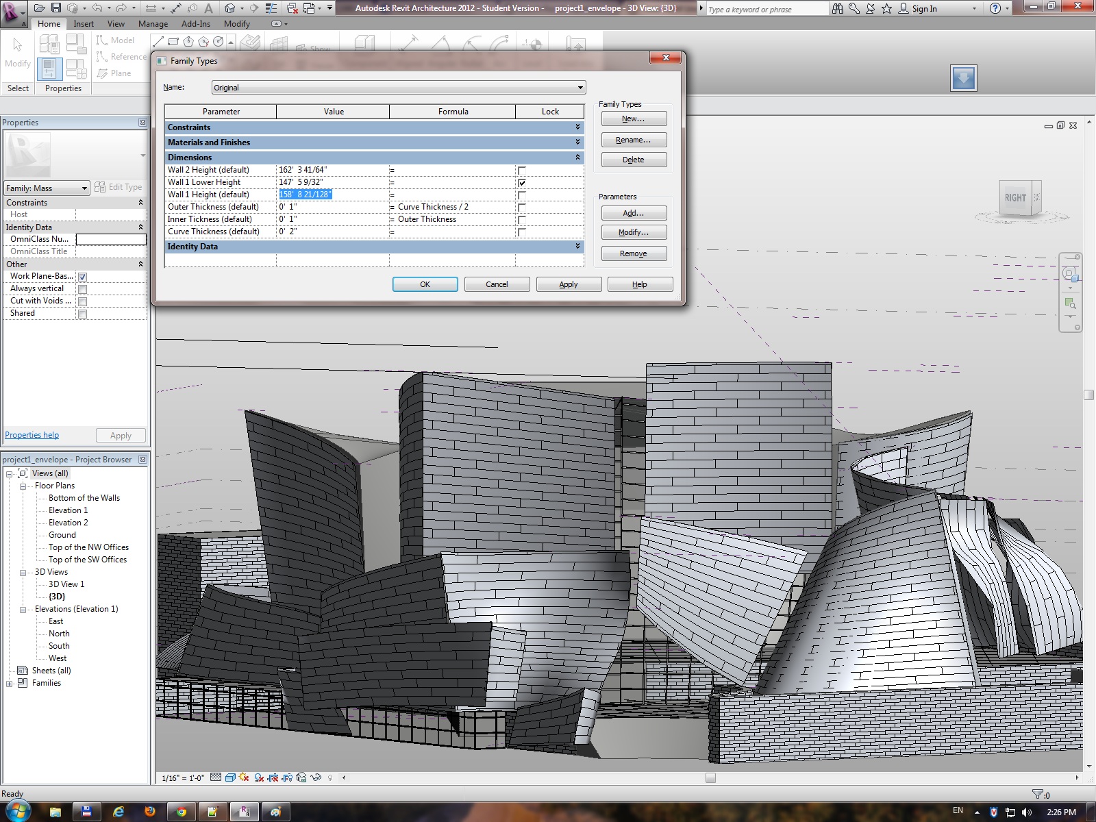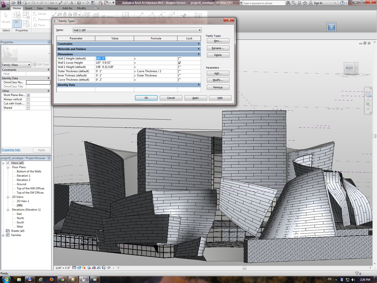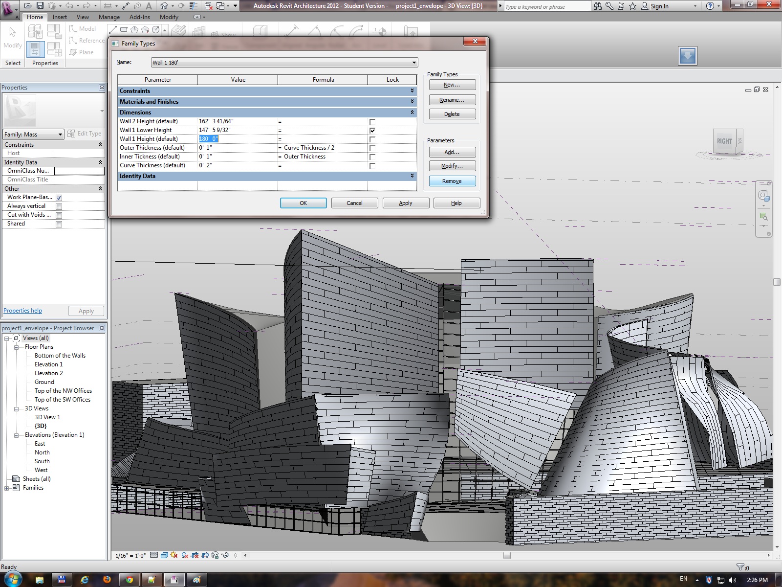 f.        All the materials (curved walls, main building, surrounding walls and exterior floors) are assigned to different parameters.